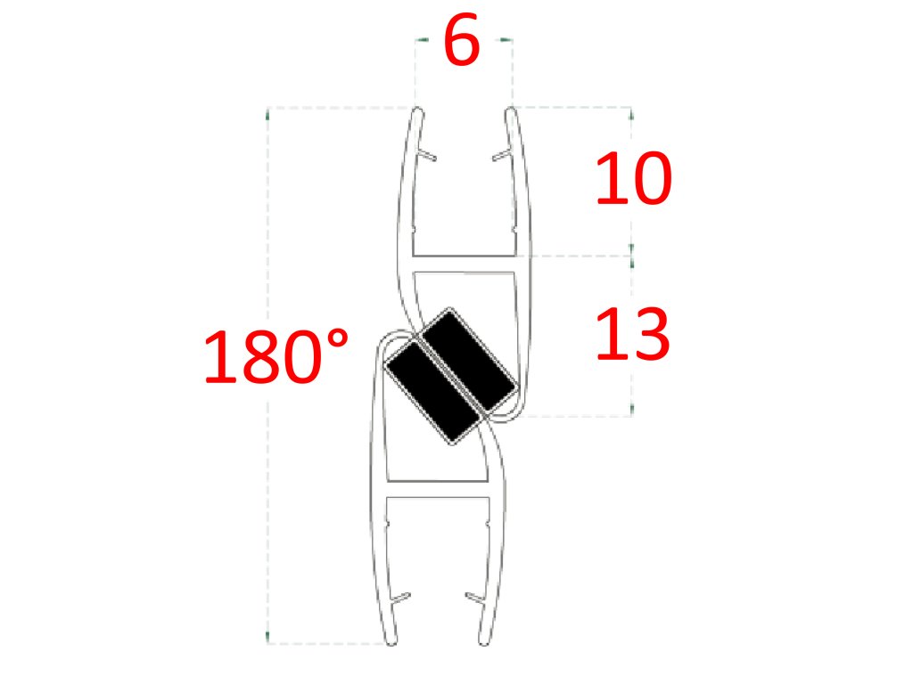 Plastové těsnění magnetické, na sklo 6mm, mezi dvoje skleněné dveře, 180°, 2200mm, 2ks