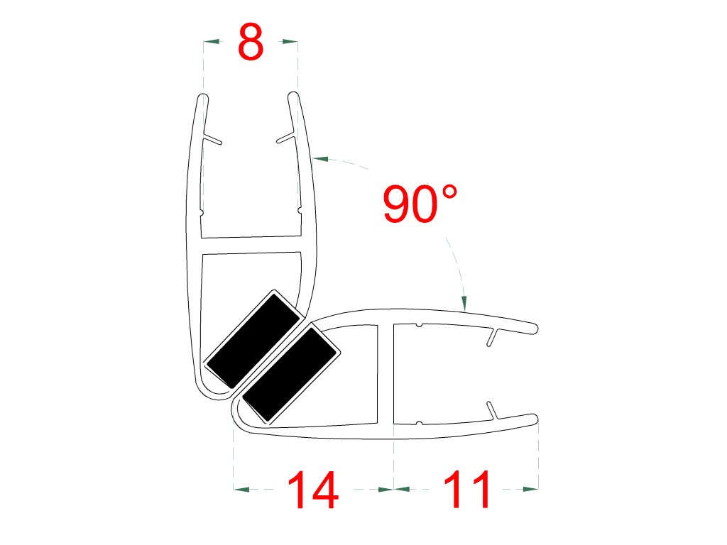 Plastové těsnění magnetické, na sklo 8 mm, mezi dvoje skleněné dveře, 90°, 2200 mm, 2 ksDoplňkové parametry