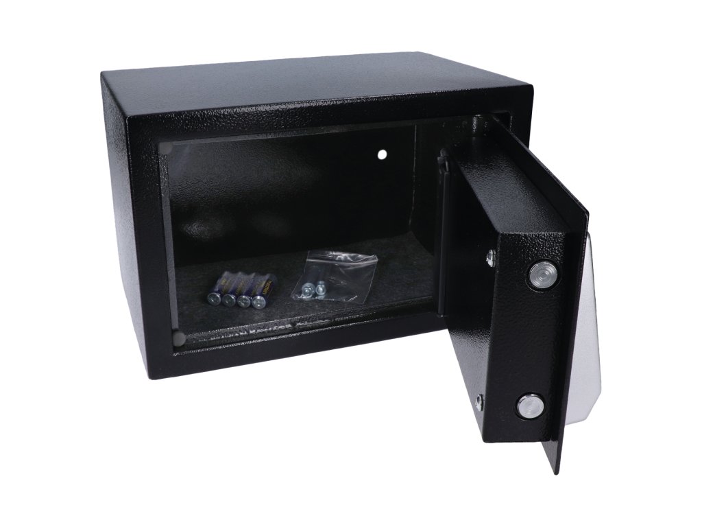 Nábytkový elektronický trezor (310x200x200mm), tloušťka: dveří 3mm, tělo 1mm, vnitřní rozměry 305x140x195mm, barva: černá, balení obsahuje 4x baterie a kotvy do stěny