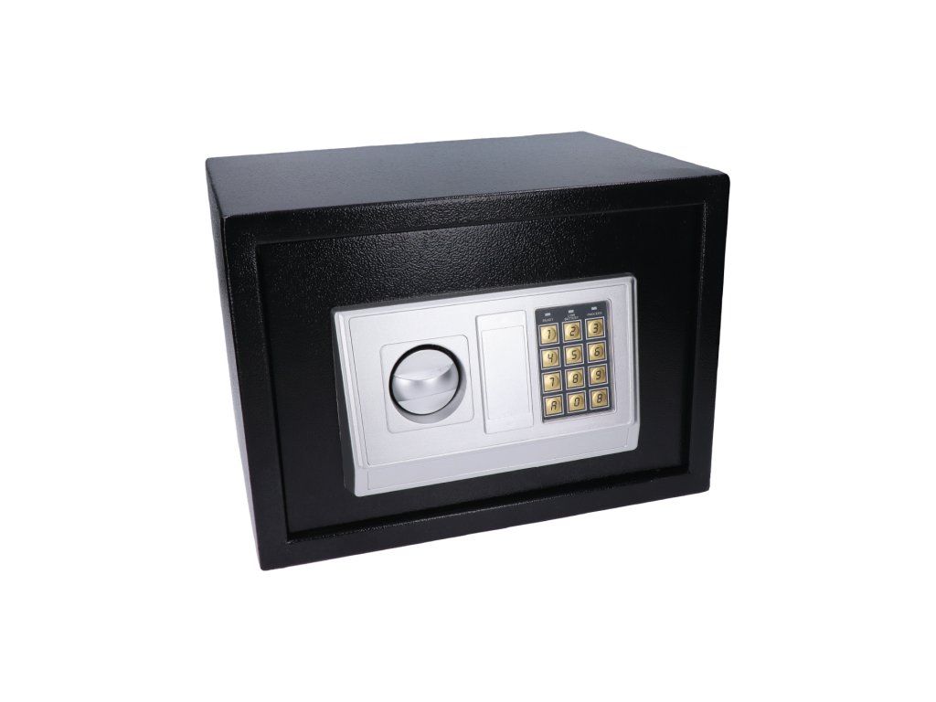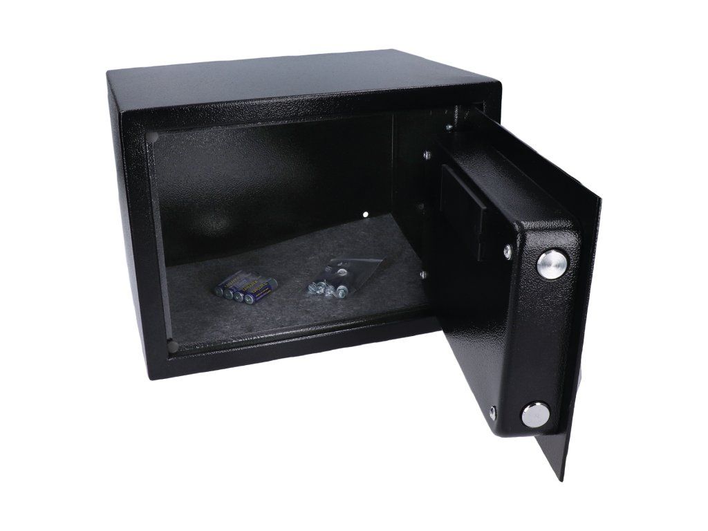 Nábytkový elektronický trezor (350x250x250mm), tloušťka: dveří 3mm, tělo 1mm, vnitřní rozměry 245x185x245mm, barva: černá, balení obsahuje 4x baterie a kotvy do stěny