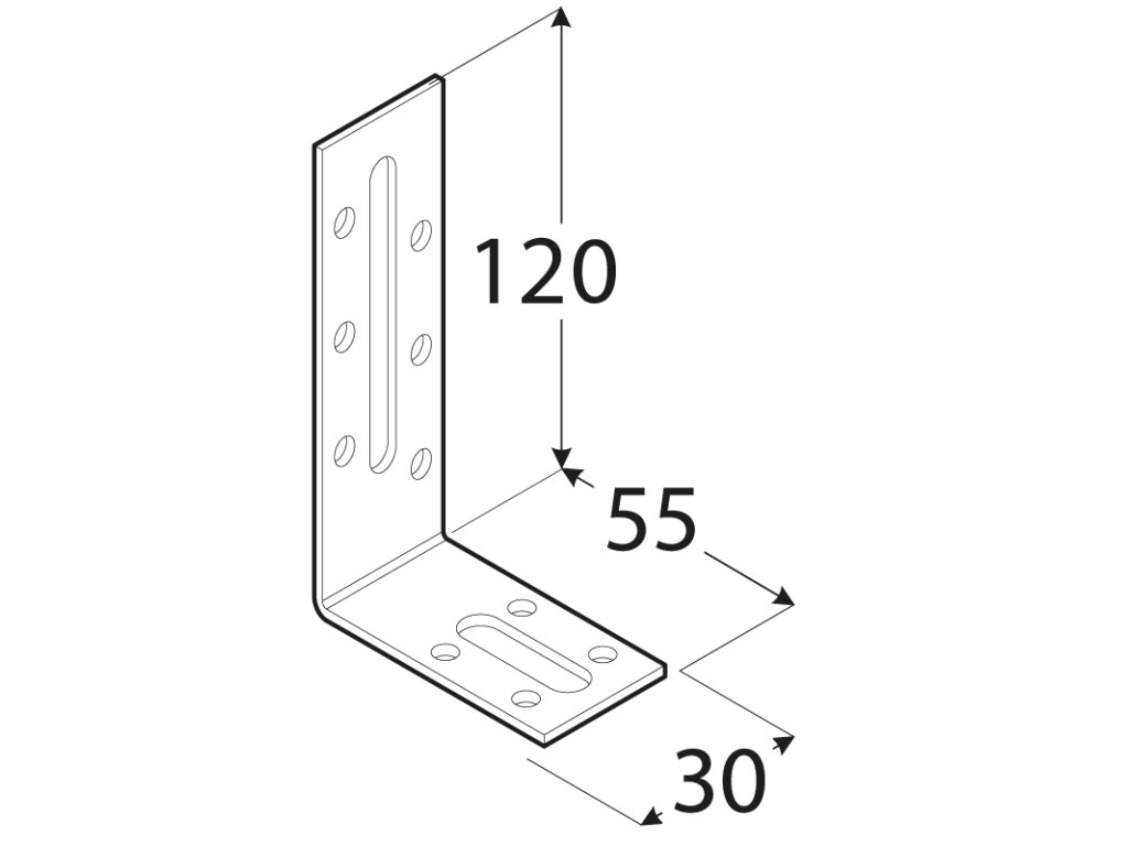 Úhelník nastavitelný 120×55×30 mm, 2,0 mm pozink, díry 5 mm – 10 ks; otvory 6,5/58,5 mm – 1 ks, 8,5/21,5 mm – 1 ks