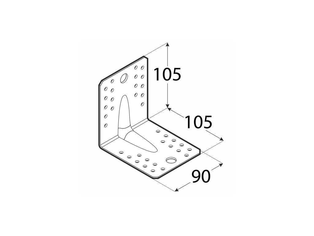 úhelník s prolisem 105x105x90mm, 2,0mm, pozink, otvory průměr 5mm-36ks, 14mm-2ks