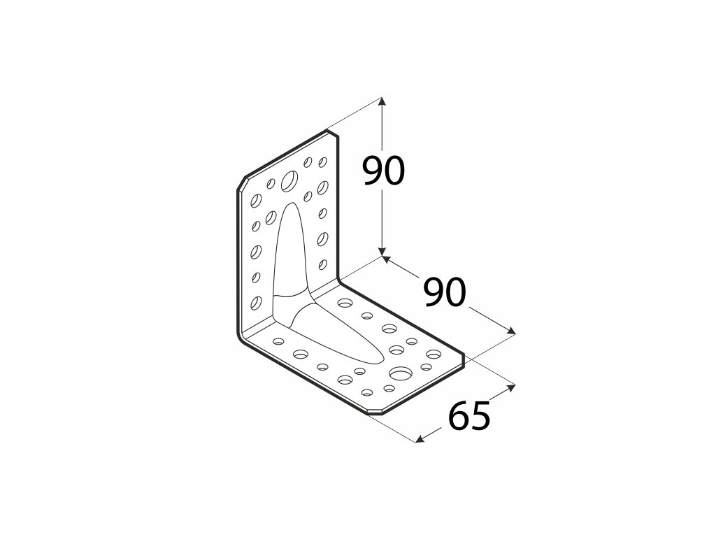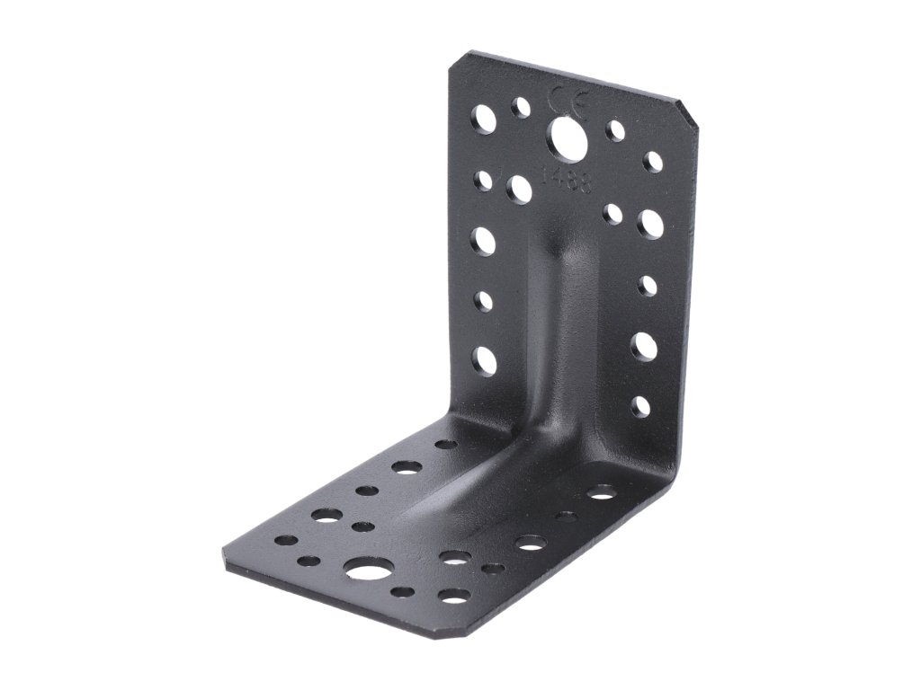 Úhelník s prolisem 90x90x65 mm, 2,0 mm, černý, otvory průměr 5 mm - 16 ks, 7 mm - 12 ks, 11 mm - 2 ks