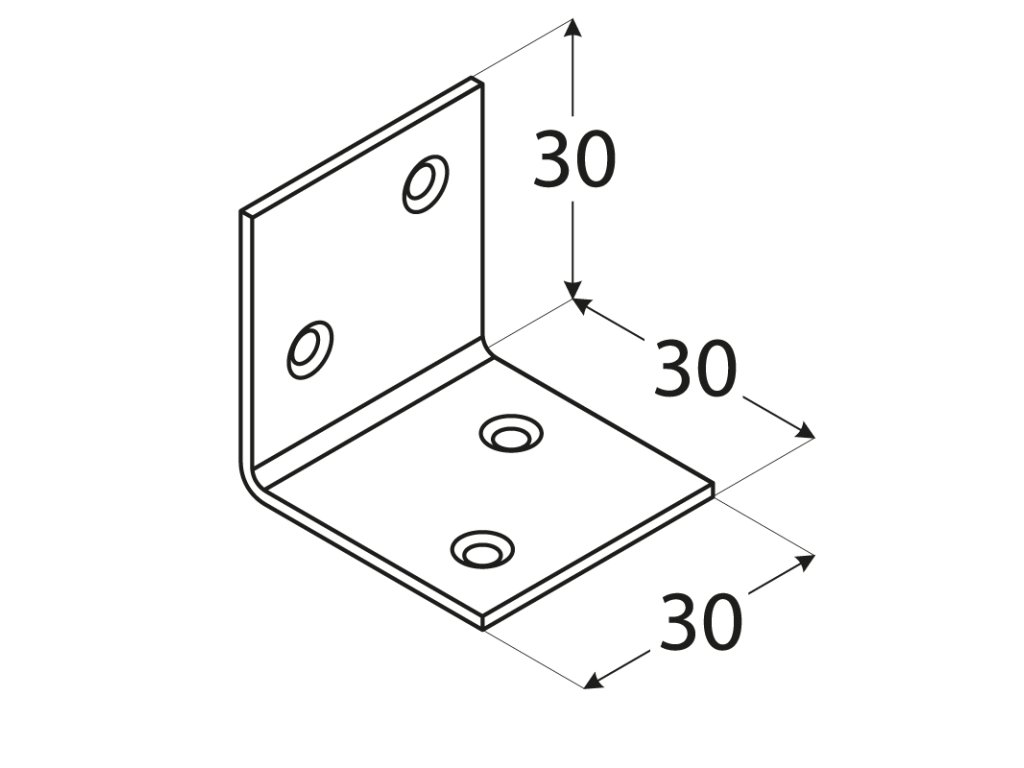 úhelník široký 30x30x30mm, 1,5mm, pozink, otvory průměr 4,5mm - v počte 4ks