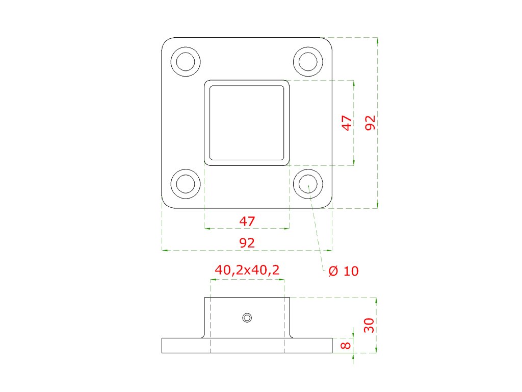 Příruba spodní (92x92 mm) na jekl 40x40 mm, broušená nerez K320 / AISI304Doplňkové parametry