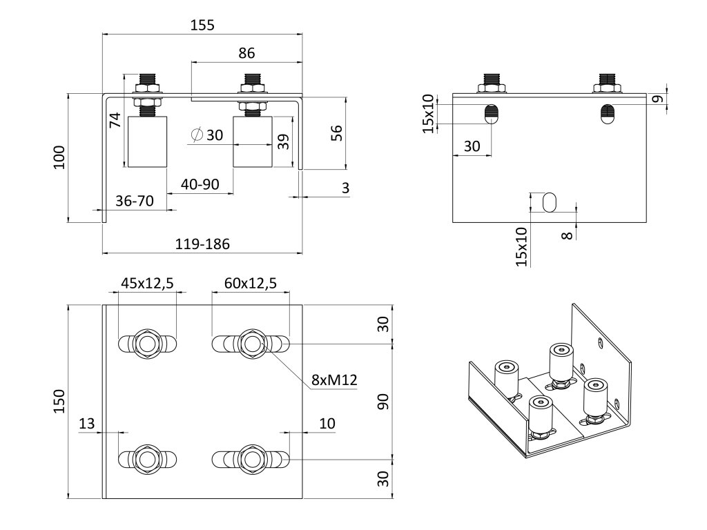 Horní vedení brány, nastavitelné pro profil 10-85mm, 4x nylon. kolečka D30mm H40mm