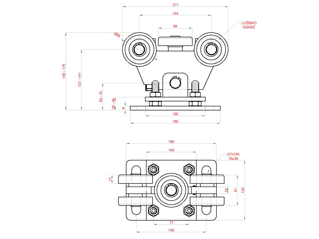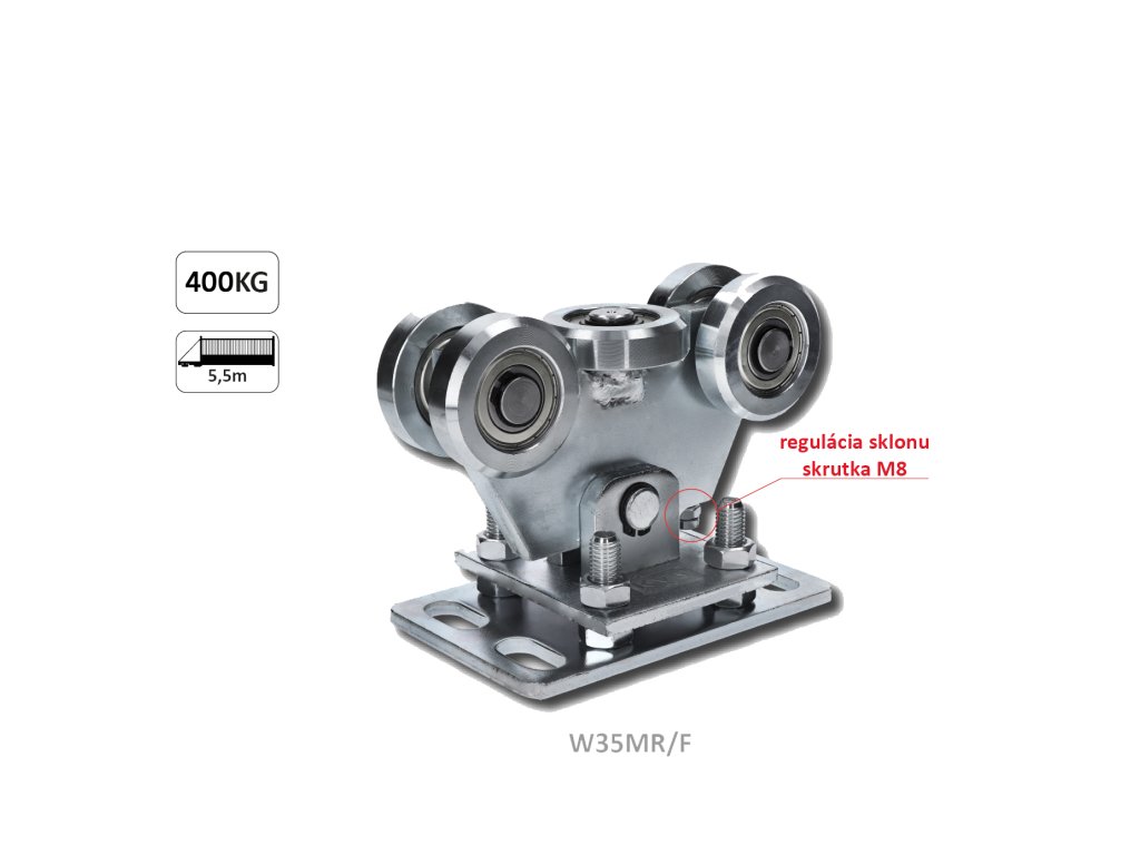 Vozík pro C-profil 80x80x5/4mm výškově nastavitelný s regulací sklonu, 5x ocelové kolečko s ložiskem 6204ZZ, galvanické zinkování