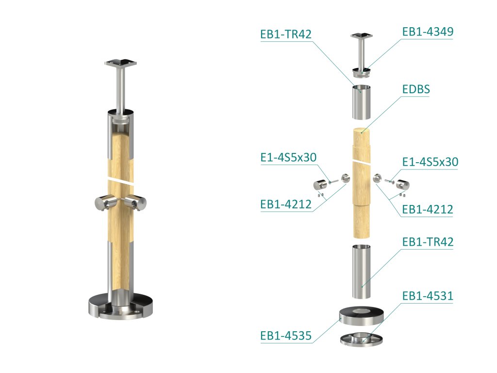 dřevěný sloup, vrchní kotvení, 4 řadový, průchozí, rohový: 90°, vrch pevný (ø 42mm), materiál: buk, broušený povrch bez nátěru