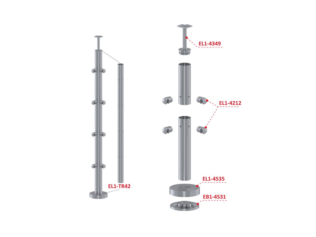 Nerezový sloup, vrchní kotvení, 4 řadový rohový: 90°, vrch pevný (ø 42,4x2 mm), leštěná nerez K600/ AISI304Doplňkové parametry
