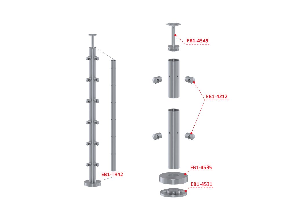 Nerezový sloup, vrchní kotvení, 6 řadový, rohový: 90°, vrch pevný (ø42,4x2 mm), broušená nerez K320 / AISI304