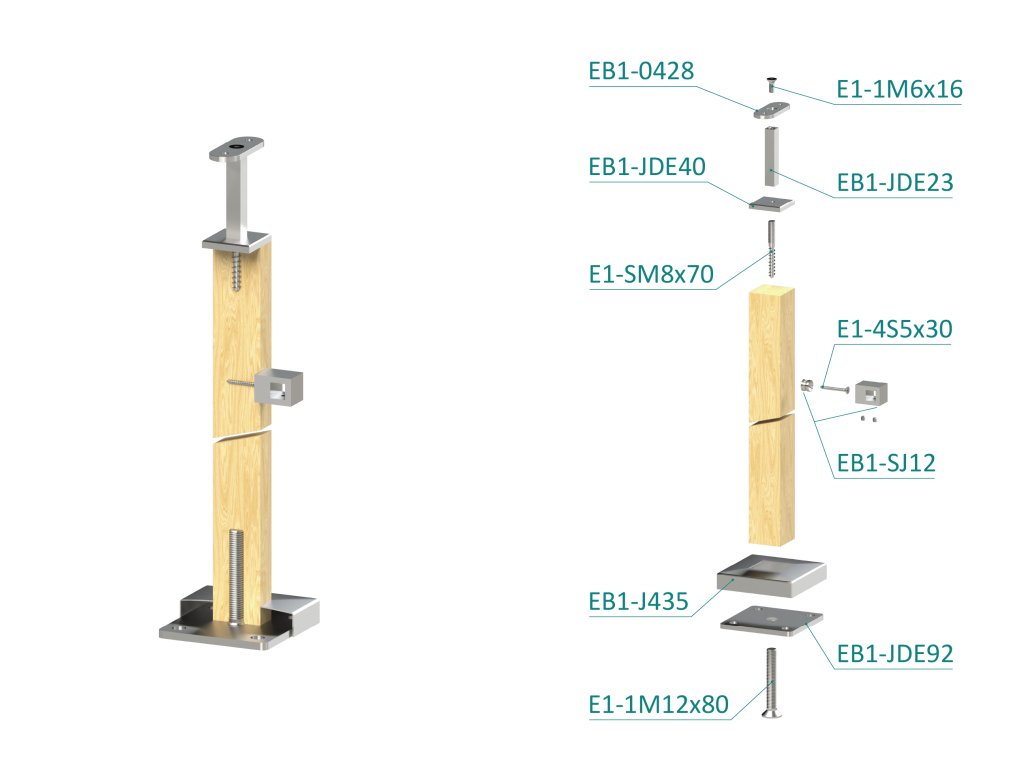 dřevěný sloup, vrchní kotvení, 4 řadový, průchozí, vrch pevný (40x40mm), materiál: buk, broušený povrch bez nátěru