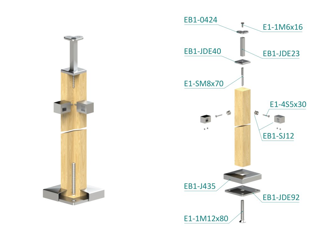 Dřevěný sloup, vrchní kotvení, 4 řadový, rohový: 90°, vrch pevný (40x40 mm), materiál: buk, broušený povrch bez nátěruDoplňkové parametry