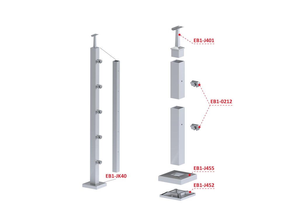 Nerezový sloup, vrchní kotvení, 5 řadový průchodný, vrch pevný,(40x40 mm), broušená nerez K320 / AISI304