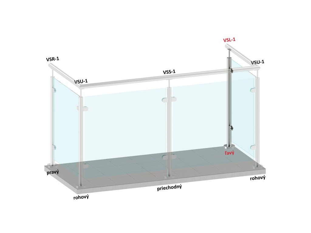 Nerezový sloup, vrchní kotvení, výplň: sklo, levý, vrch pevný (ø42,4x2 mm), broušená nerez K320 / AISI304Doplňkové parametry