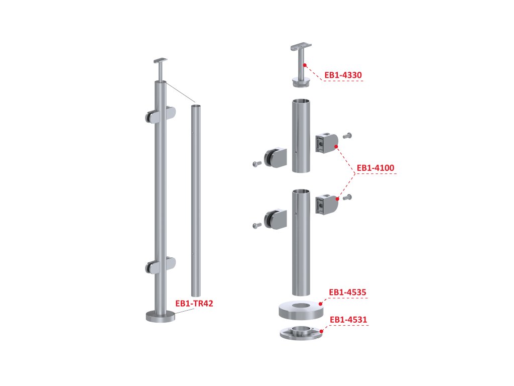 Nerezový sloup, vrchní kotvení, výplň: sklo, průchozí, vrch pevný (ø42,4x2 mm), broušená nerez K320 / AISI304Doplňkové parametry