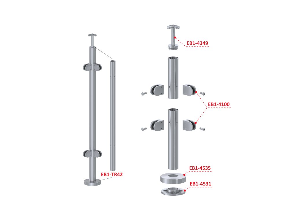 Nerezový sloup, vrchní kotvení, výplň: sklo, rohový: 90°, vrch pevný (ø42,4x2 mm), broušená nerez K320 / AISI304Doplňkové parametry