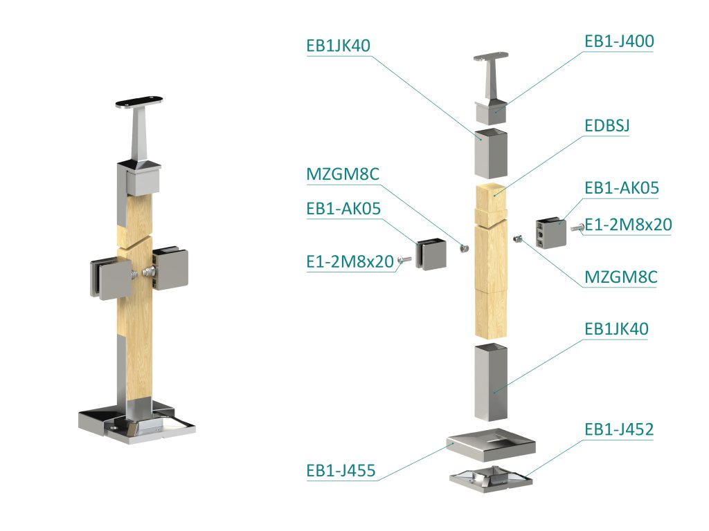 dřevěný sloup, vrchní kotvení, výplň: sklo, průchozí, vrch pevný (40x40mm), materiál: buk, broušený povrch bez nátěru