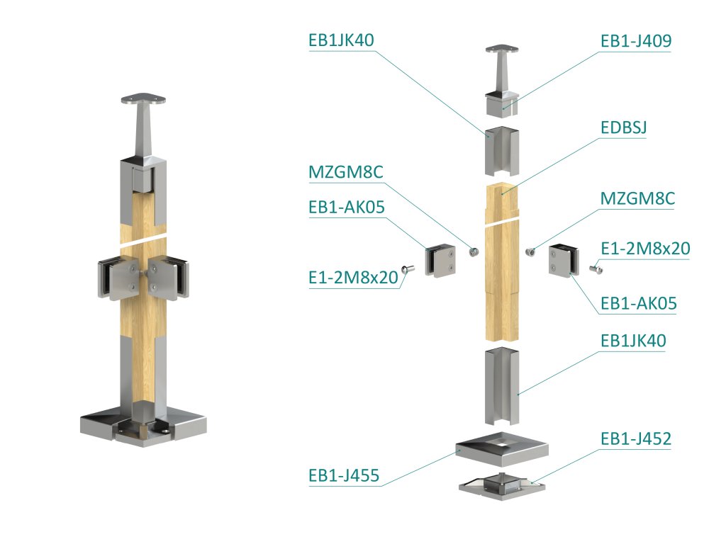 dřevěný sloup, vrchní kotvení, výplň: sklo, rohový, vrch pevný (40x40mm), materiál: buk, broušený povrch s nátěrem BORI (bezbarvý)