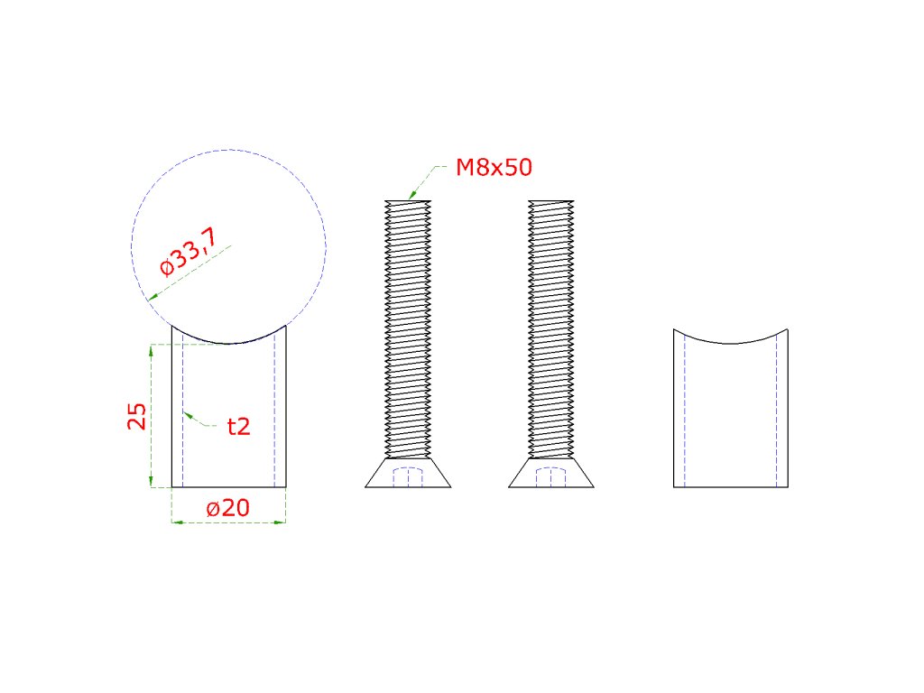 Přechod na vymezení vzdálenosti mezi sloupem ø 33,7 mm a kotevní deskou, ø 20x2,0 mm /L:25 mm, vnitřní šroub: M8x50 mm, broušená nerez K320 / AISI304, bal: 2ksDoplňkové parametry