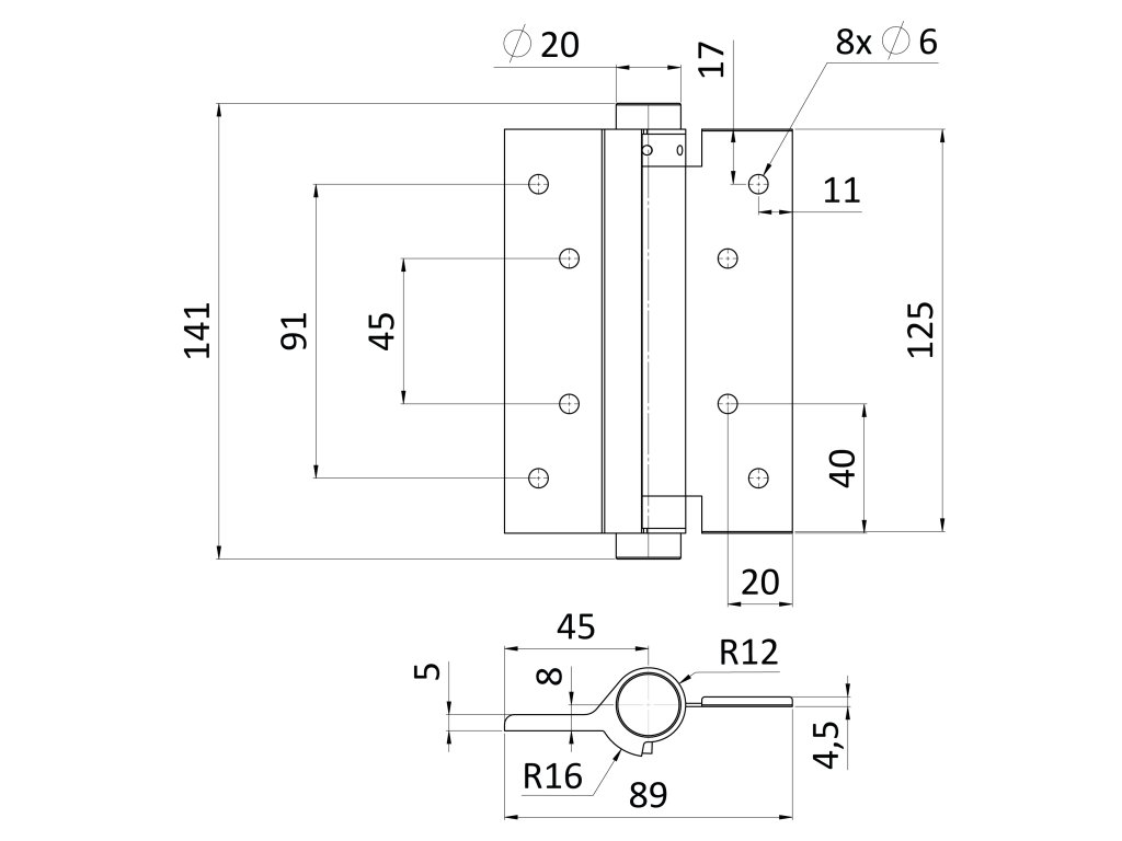 Samozavíravý pant pro křídlové dveře, H = 125 mm, nerezový