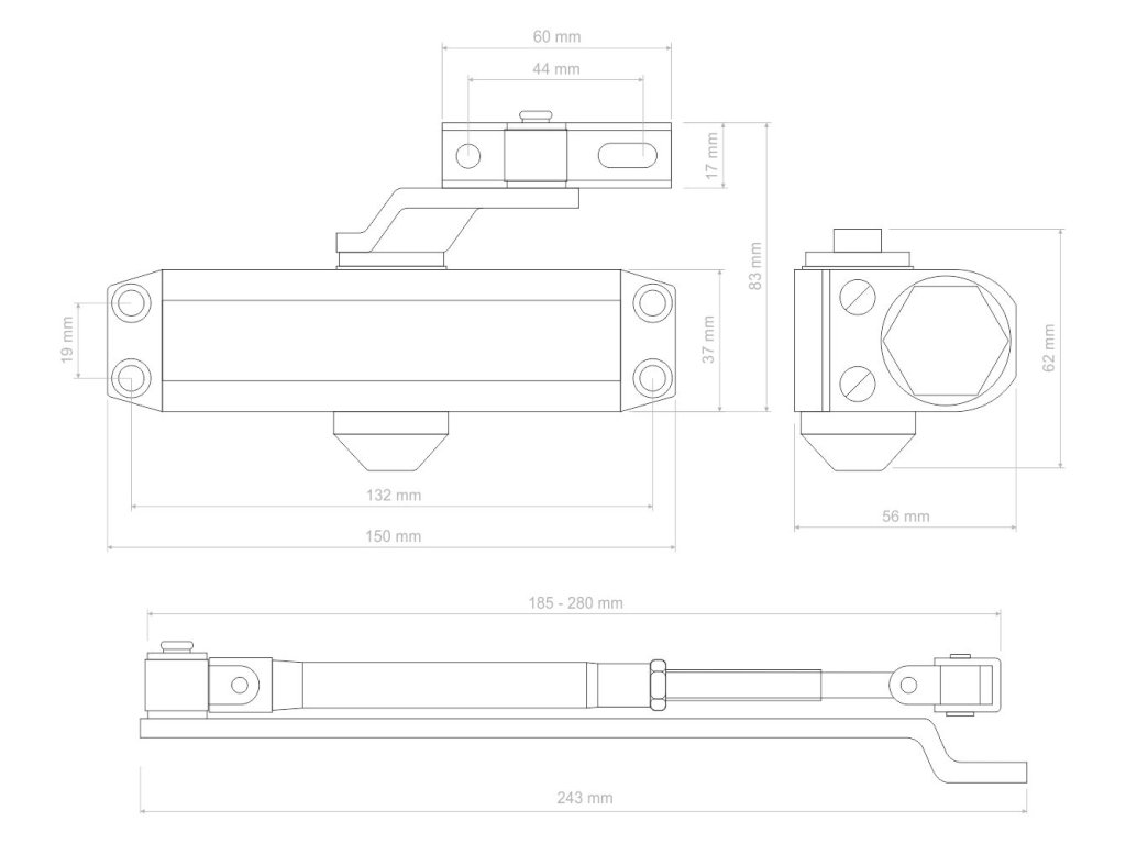 Hydraulický zavírač (148x36x56 mm) pro interiérové dveře, max. délka dveří: 850 mm / max. váha dveří: 45 kg, materiál: AL s povrchovou úpravou - stříbrná