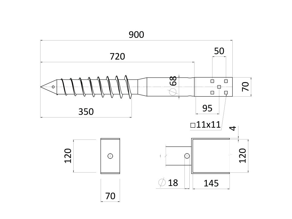 Zemní vrut – patka U, 120×900 mm, žárový zinek