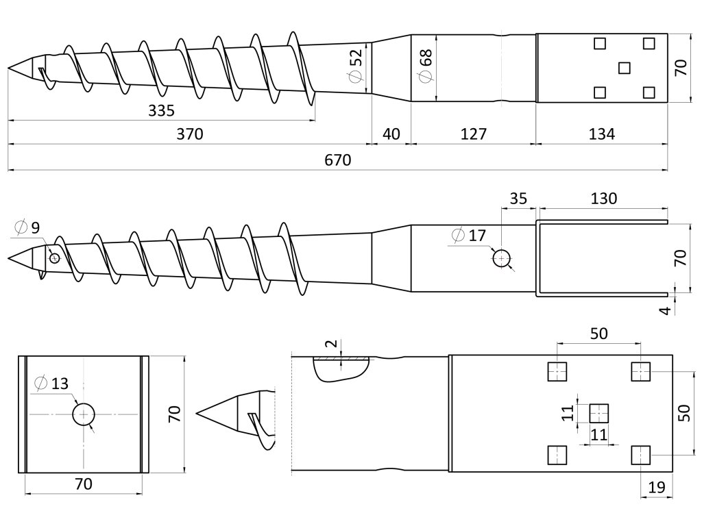 Zemní vrut – patka U, 70×700 mm, žárový zinek