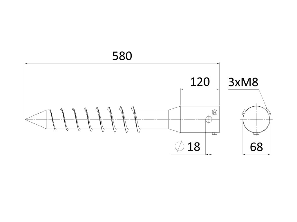 Zemní šroub / zemní vrut - O, 68x580mm, žárový pozink, 3xM8