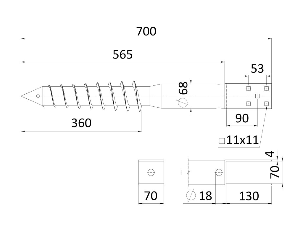 Zemní vrut, patka U, 70 x 70 mm, žárový pozink