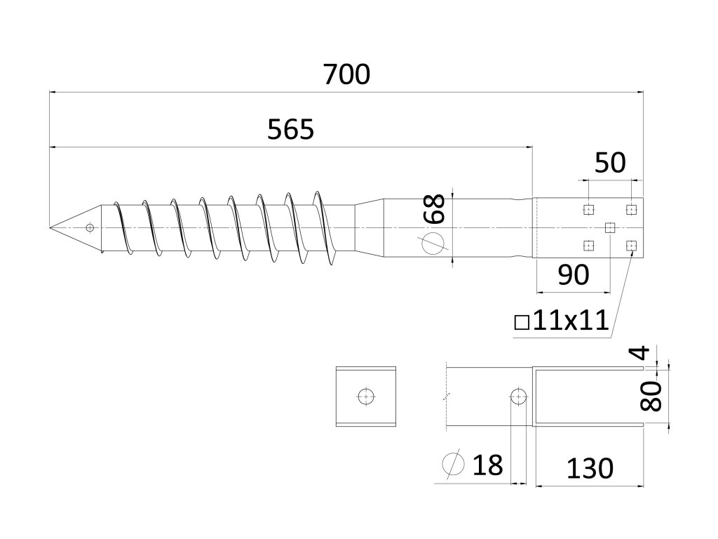 Zemní vrut, patka U, 80 x 80 mm, zinková barva
